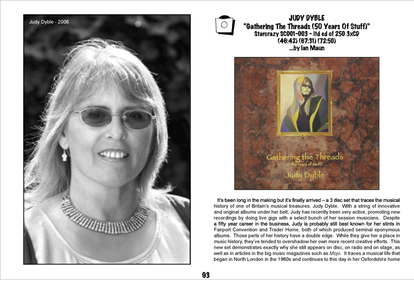 She may be praised as a national treasure now, but only core followers were interested in what Judy Dyble‘s been doing in the time when her name didn’t grace the music press pages. And here’s a reward for the aficionados’ loyalty: compiled and issued by the singer herself, this 3CD-box offers a genuine continuity with a fantastic selection of Dyble’s album fare, rarities previously scattered across limited editions and collaborative efforts, and recordings that haven’t seen the light of the day before. More so, it reveals Judy as an intrepid experimentalist as well as traditionalist.