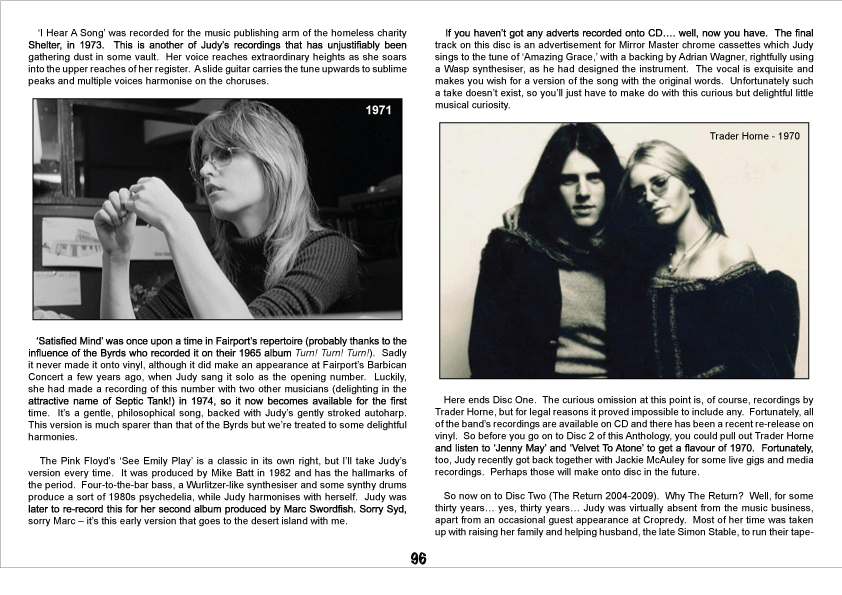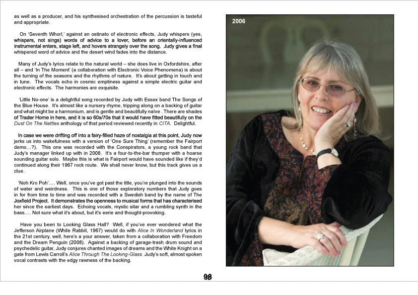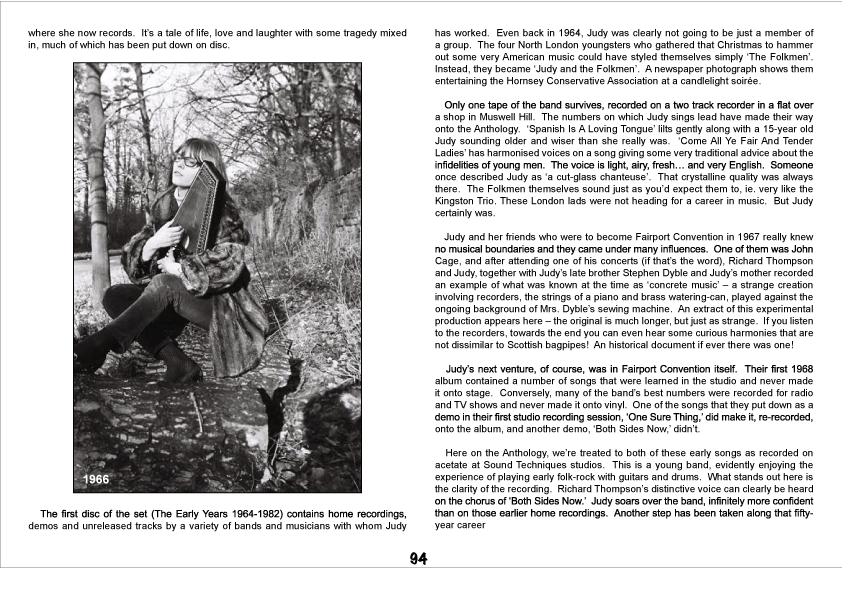 Although ordered chronologically, the collection ends with a recentconcert take on “If I Had A Ribbon Bow” which the chanteuse entered a public eye with, when she fronted FAIRPORT CONVENTION, and their fans will be happy to hear a couple demos from 1967. One of these is the deeply emotional “One Sure Thing” that Dyble would revisit in a crunchier, almost punk setting with THE CONSPIRATORS in 2008, on a single housed on CD2, yet there are earlier tracks – two home recordings from 1964, “Come All Ye Fair And Tender Ladies” showing the 15-year-old artist not afraid to infuse an Appalachian tune with her own, English personality. Yet in 1966, in the company of Richard Thompson, she went much further, for a riveting folk-tinged improvisation, present on the first disc in a much abridged form than is on the source tape and throwing a bridge to Judy’s later sonic adventures like solo “Seventh Whorl” or “Noh Kro Poh” that she notched for JOXFIELD PROJECT.