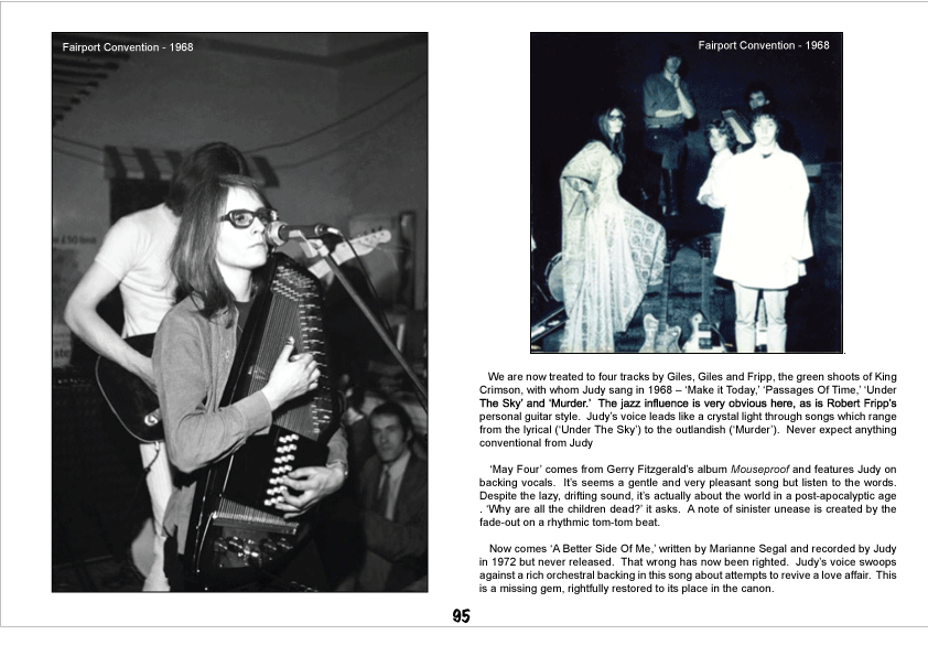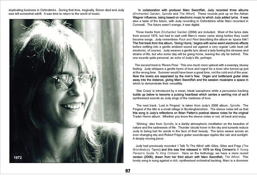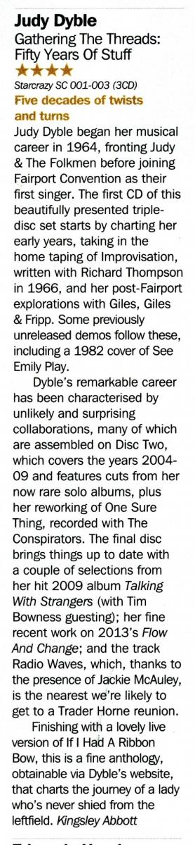In such a context, the singer’s work with GILES GILES & FRIPP in 1968 feels only logical, tracks like “Make It Today” demonstrating Dyble’s talent at handling jazzier material, which is also manifested on 2014’s outtake “RadioWaves” – the duet with Jackie McAuley could have been a reunion of TRADER HORNE whose tapes are absent from “Threads” due to contractual reasons – and it was Judy who first recorded “I Talk To The Wind” that she updated on 2006’s solo album “The Whorl” to add magic and maturity to it. There’s a woman’s touch to this ballad, too, but the singer was enchanted enough with Greg Lake‘s approach to appropriate his “C’est La Vie” for her "Talking With Strangers" in 2009 and take it to crystalline heights. Judy’s ability to adapt and transform comes forth on a backing vocals job be it in the 2012 on “Weather Changes” for DODSON AND FOGG or back in 1970 on G.F. Fitzgerald’s “May Four.”