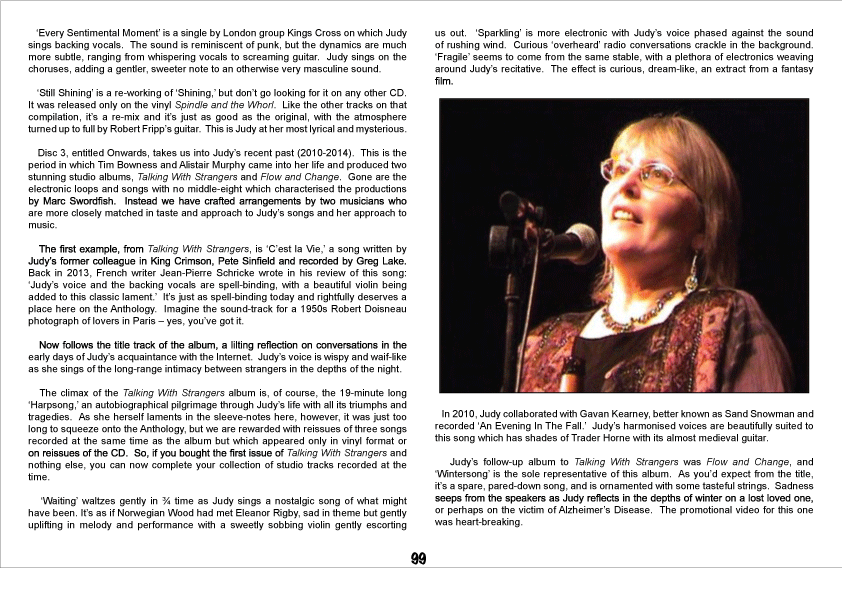 The artist breathes transparent fire into “Shining” whose “I am lost for words” refrain lingers in one’s mind long after its rays dissolve in vibrant silence, although her longest suites – LP side-long “Harpsong” and “The Sisterhood Of Ruralists” – aren’t part of the box. Scope aside, it’s nigh on impossible to imagine gentle Judy in a metal mode, yet here she is, grafting a second voice to “Every Sentimental Moment” on a KINGS CROSS single in 2009, but the title piece on “Talking With Strangers” finds Dyble in her very element – piano-backed and soaring, while freezing her flight down to a faux-fairy tale of “Wintersong” off 2013’s "Flow And Change".