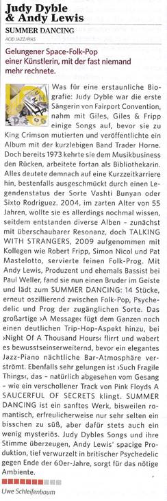 What an astounding biography: Judy Dyble was the first singer with Fairport Convention, made some recordings with Giles, Giles and Fripp before they became King Crimson and released an album with the short lived band Trader Horne. In 1973 she turned her back on the music business and from then on worked as a librarian. Hers looked like being a short music career which at best would be granted legendary status similar to Vashti Bunyan or Sixto Rodriguez. In 2004 at the age of 55, she decided to give it another try. Since then she has released several albums, initially to faint response. Then 2009’s “Talking With Strangers”, recorded with colleagues such as Robert Fripp, Simon Nicol and Pat Mastelotto served up delicate folk-prog. With Andy Lewis, producer and former bassist with Paul Weller, she has found a spiritual brother and invites us to “Summer Dancing”: 14 pieces of music which oscillate between folk-pop, psychedelic and prog of the listenable sort. The fantastic “A Message” even adds a notable trip-hop aspect to the mix. ”Night Of A Thousand Hours” shimmers and billows psychedelically before flowing elegantly into a jazz piano nighttime bar feeling. Also successful is the track “Such Fragile Things” which sounds, apart from the vocals, like a long lost track from Pink Floyd’s A Saucerful Of Secrets. Summer Dancing is a gentle work, occasionally romantic, gratifyingly very seldom too sweet, but invariably somewhat mysterious. Judy Dyble’s voice and songs are captivating and Andy Lewis’ spacy production, rooted in late 60s British psychedelia, perfects the atmosphere UweSchleifenbaum