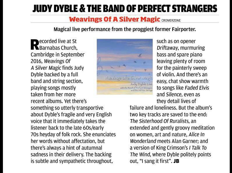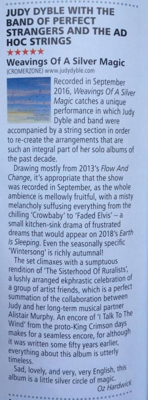 There’s something enticing and entirely captivating about her creations, they’re charismatic vignettes which may take time to mature, though since she began work with Alistair Murphy a decade since her music has taken on far more form and substance. Herewith ‘Weavings Of A Silver Magic,’ is the second live offering from Miss Dyble but this one differs in virtually every degree from ‘Live At WM Jazz.’ Recorded at St. Barnabas Church in Cambridge, with her regular backing musicians Perfect Strangers along with sundry percussion, keyboards and an elegant sounding string section with the tongue in cheek name of Ad Hoc! What was produced and has since been heightened by other gigs including a super showing at Cropredy are tracks from her contemporary albums as well as an old rework from the days when she sang with a proto King Crimson.