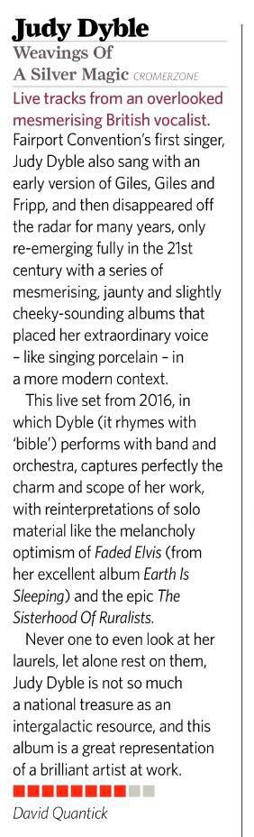 Things haven’t always gone smoothly for Judy Dyble, the resilient sort of lady who thoroughly deserved her 2004 reawakening, from which she’s spun a whole line of albums which reveal her as a writer of other worldly fantasy, songs about things just slightly out of view or round a corner.