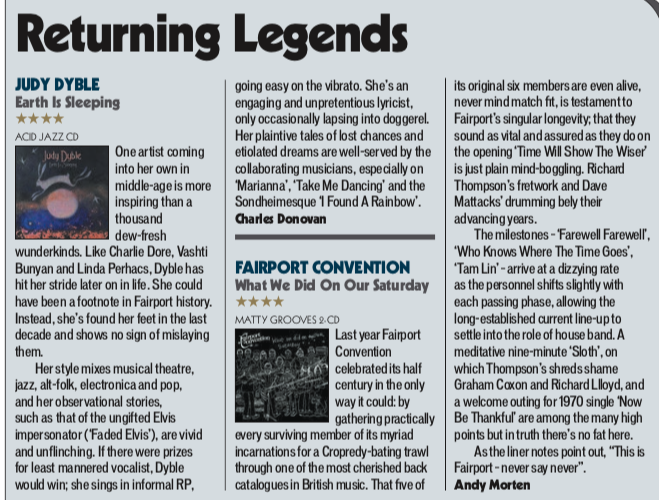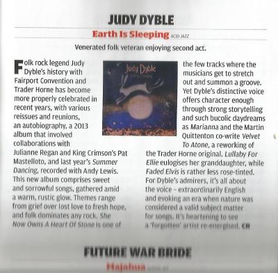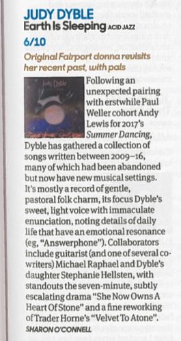 A new Judy Dyble album descends, the follow-up (at last) to 2013’s Flow and Change, although a glance at her discography shows how busy she’s been in between times… in fact, last year’s Summer Dancing collaboration with Andy Lewis is still on the turntable as Earth Is Sleeping (Acid Jazz) arrives to displace it, but fair exchange is no robbery, and this one, too, is a cracker.